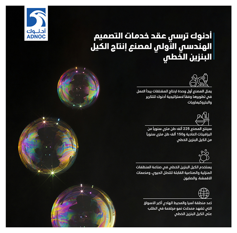 ويمثل عقد أعمال التصميم الهندسي الأولي ركيزة أساسية في مشروع تطوير مصنع إنتاج الكيل البنزين الخطي، الذي ستقوم بتنفيذه "تكنكاس ريونيداس" شركة الأعمال الهندسية التي يقع مقرها في إسبانيا والتي تزاول عملها في دولة الإمارات منذ عام 2006. وستقوم كل من أدنوك و"سيبسا"، شركة النفط الإسبانية المتكاملة المملوكة بالكامل لشركة مبادلة للاستثمار التابعة لحكومة أبوظبي، بإدارة المشروع.