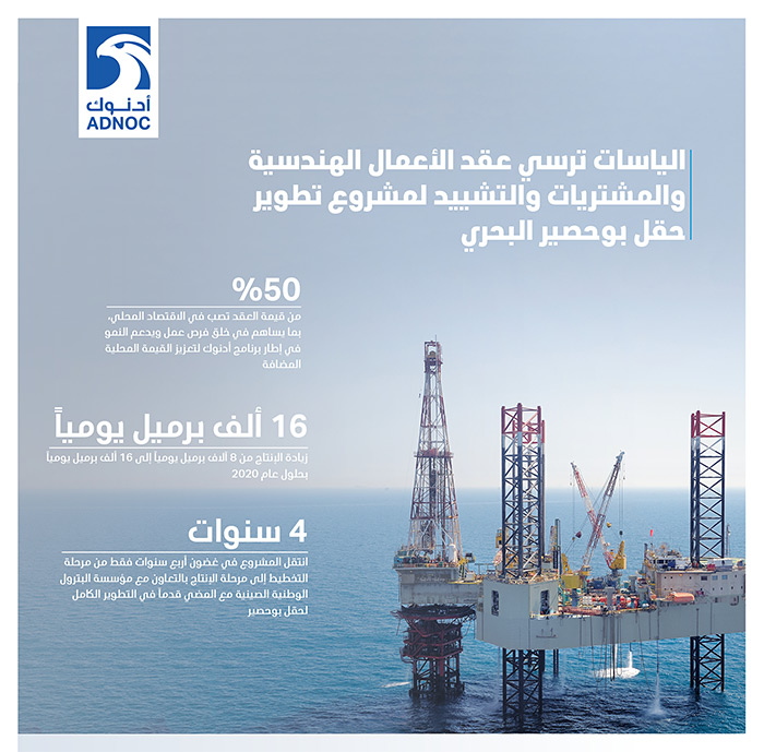 أبوظبي 2 يوليو 2018: أعلنت شركة الياسات للعمليات البترولية المحدودة (الياسات)، إحدى الشركات التابعة لشركة بترول أبوظبي الوطنية (أدنوك)، عن ترسية عقد الأعمال الهندسية والمشتريات والتشييد لمشروع التطوير الكامل لحقل بوحصير البحري على شركة الإنشاءات البترولية الوطنية.