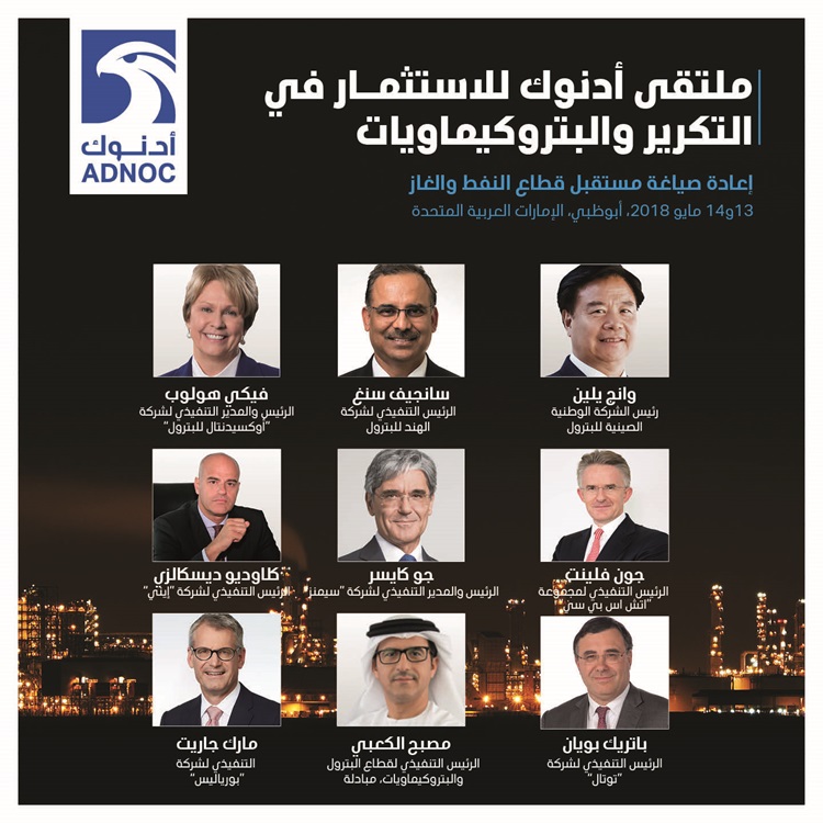 أبوظبي 8 مايو 2018: أكدت شركة بترول أبوظبي الوطنية "أدنوك" اليوم مشاركة أكثر من 40 رئيساً تنفيذياً لكبريات شركات النفط والغاز والبتروكيماويات العالمية، ونحو 700 من قادة الأعمال والمتخصصين وصُنّاع القرار في "ملتقى أدنوك للاستثمار في التكرير والبتروكيماويات" الذي يقام في 13 مايو في العاصمة أبوظبي. ويعكس هذا الاهتمام مكانة الحدث ودوره الفاعل محلياً وعالمياً.