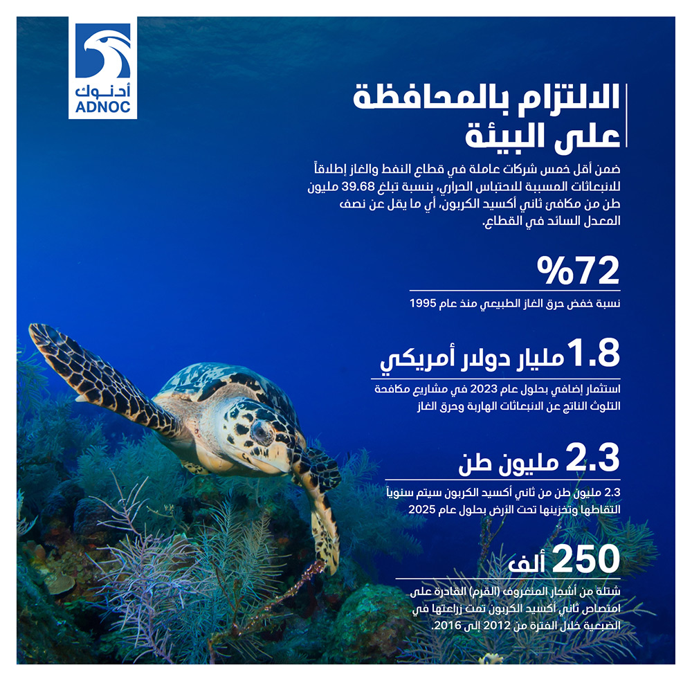 وفيما تستمر أدنوك بالتركيز على تلبية نمو الطلب العالمي على الطاقة، تستثمر الشركة أيضاً في إجراءات جديدة لخفض البصمة البيئية لأنشطتها، حيث تخطط لخفض الانبعاثات المسببة للاحتباس الحراري بنسبة تصل إلى 10% بحلول عام 2023، وزيادة تطبيق تقنية التقاط ثاني أكسيد الكربون واستخدامه وتخزينه، والحد من استخدام المياه العذبة وخفض حجم المواد المرسلة إلى مدافن النفايات.