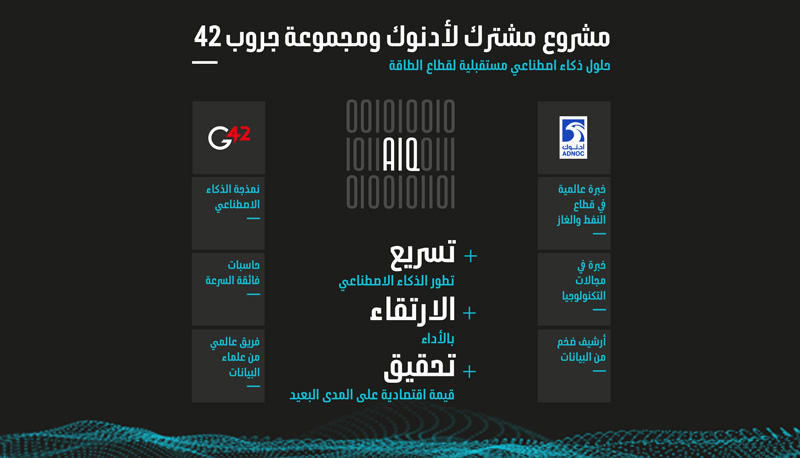وستركز AIQ على تطوير منتجات وتطبيقات الذكاء الاصطناعي المخصصة لقطاع النفط والغاز وتسويقها تجارياً. وتجمع هذه الشراكة بين خبرة "جروب-42" في مجال نمذجة الذكاء الاصطناعي والحاسبات فائقة السرعة وفريقها العالمي من علماء البيانات ومهندسي البرمجيات وخبراء النطاقات، مع خبرة أدنوك عالمية المستوى في صناعة النفط والغاز وأرشيفها الضخم من البيانات.