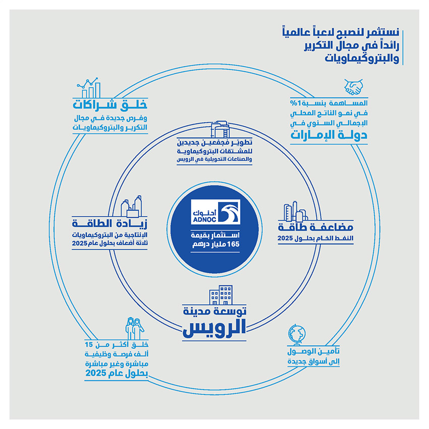 وستقوم أدنوك بالبناء على نقاط القوة والمزايا التنافسية لمجمع الرويس الصناعي، وتطويره وتوسعته ليصبح أكبر مجمع متكامل ومتطور للتكرير والبتروكيماويات في موقع واحد في العالم. وتعتزم أدنوك من خلال برنامجها للاستثمار والشراكات الاستراتيجية زيادة نطاق وحجم منتجاتها ذات القيمة العالية، وتحسين الوصول إلى الأسواق ذات معدلات النمو المرتفعة حول العالم، فضلاً عن خلق منظومة تصنيع في الرويس من شأنها الإسهام بصورة كبيرة في تعزيز القيمة المحلية المضافة ونمو القطاع الخاص وخلق فرص عمل جديدة. ومن المتوقع أن توفر استراتيجية أدنوك الجديدة في مجال التكرير والبتروكيماويات أكثر من 15 ألف فرصة عمل بحلول عام 2025، وأن تُساهم بإضافة 1% إلى الناتج المحلي الإجمالي سنوياً.