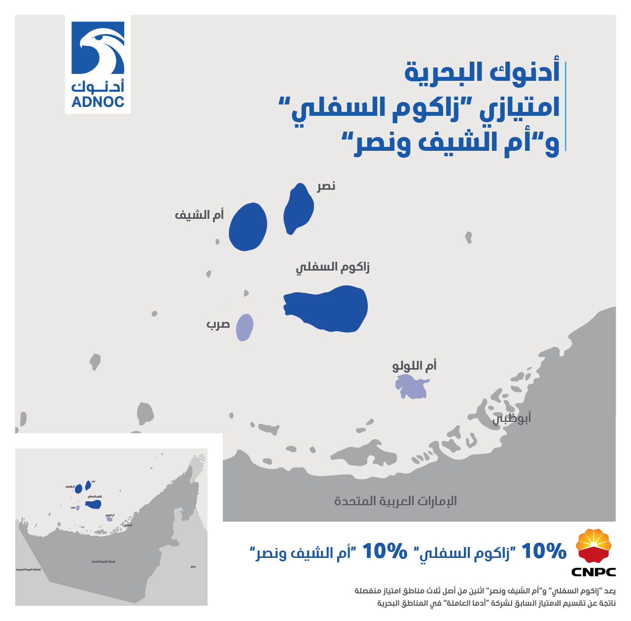وقدمت مؤسسة البترول الوطنية الصينية، من خلال شركة "بترو تشاينا" التابعة لها ، 2.1 مليار درهم (575 مليون دولار أمريكي) رسم مشاركة في امتياز "أم الشيف ونصر" و2.2 مليار درهم (600 مليون دولار أمريكي) رسم مشاركة في امتياز "زاكوم السفلي" اللذين ستتولى إدارتهما "أدنوك البحرية"، إحدى شركات مجموعة أدنوك، نيابةً عن جميع الشركاء.