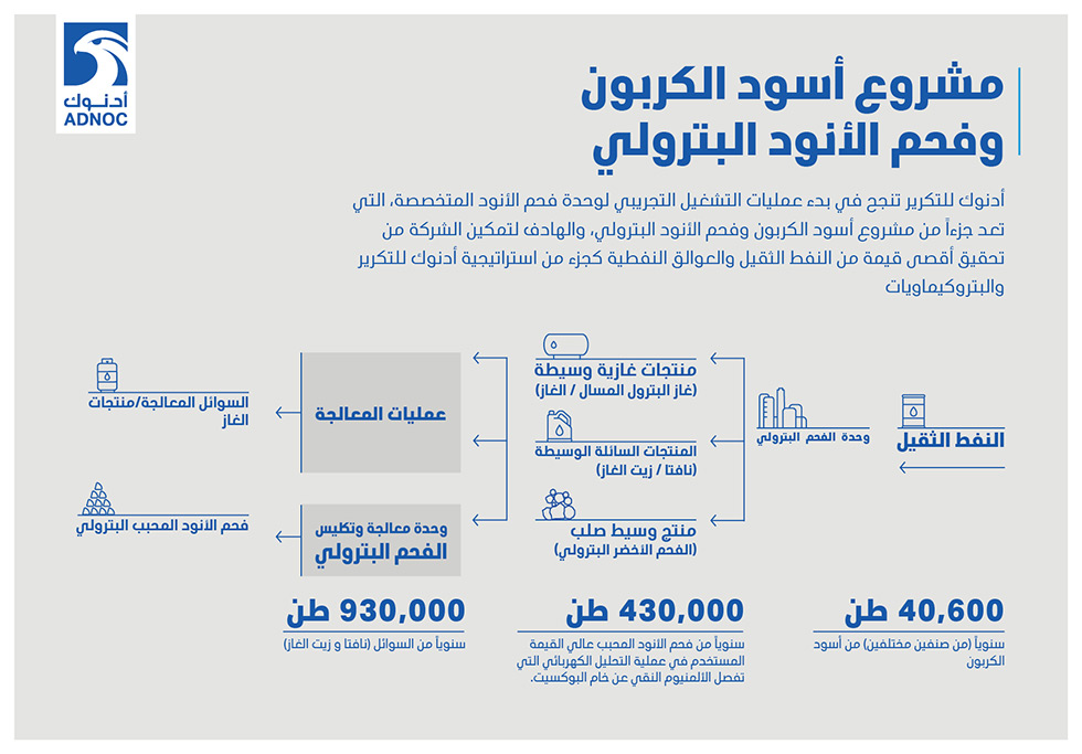ويهدف مشروع أسود الكربون وفحم الأنود البترولي التابع لأدنوك إلى استرداد أصناف من أسود الكربون والكوك عالية الجودة تستخدم في أغراض خاصة مما يمكن الشركة من خلق قيمة إضافية من المواد التي كانت تستخدم في إنتاج وقود منخفض القيمة، علاوة على أهمية هذه المنتجات في تلبية الاحتياجات الضرورية للعمليات الصناعية لشركات مجموعة أدنوك والصناعات الأخرى في دولة الإمارات مما يحد من الحاجة لاستيراد وتوفير مواد أولية غالية الثمن.