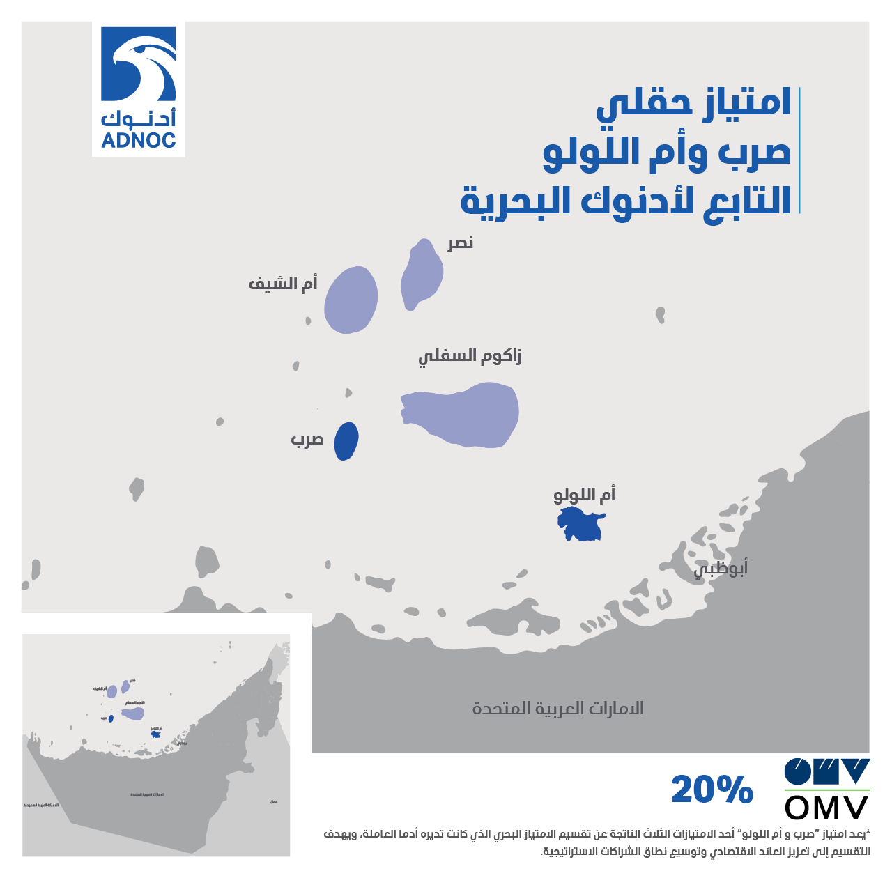 وقدمت شركة "أو أم في" رسم مشاركة بقيمة 5.5 مليار درهم (1.5 مليار دولار أمريكي) يشمل استثمارات أدنوك السابقة في حقل صرب، فيما تحتفظ أدنوك بحصة الأغلبية والتي تبلغ 60% من الامتياز الذي ستديره "أدنوك البحرية"، إحدى شركات مجموعة أدنوك، نيابةً عن شركاء الامتياز.