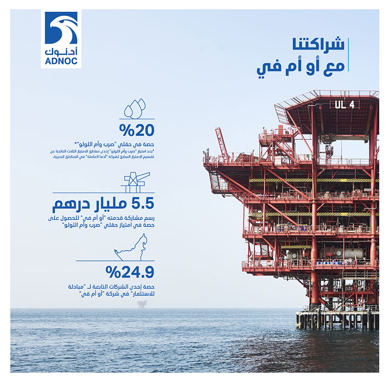 أبوظبي، 29 أبريل 2018: وقعت شركة بترول أبوظبي الوطنية أدنوك اليوم اتفاقية امتياز في الحقول البحرية مع شركة "أو أم في" النمساوية للنفط والغاز المملوكة جزئياً لإحدى الشركات التابعة لـ "مبادلة للاستثمار"، تحصل بموجبها الأخيرة على حصة 20% في امتياز "صرب وأم اللولو" البحري.