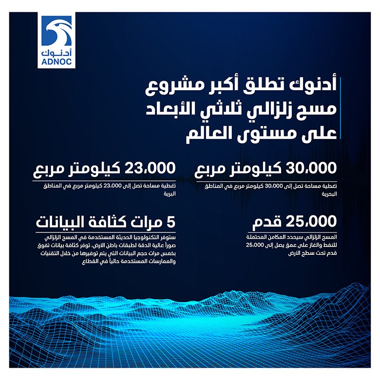 وسيغطي مشروع المسح الزلزالي الجديد مساحة إجمالية تصل إلى 53 ألف كيلومتر مربع، منها 30 ألفاً في المناطق البحرية و23 ألفاً في المناطق البرية، مما يسهم في توفير بيانات جديدة تضاف إلى بيانات المسح الزلزالي ثنائي وثلاثي الأبعاد التي تم الحصول عليها سابقاً من عدة مناطق في أبوظبي.
