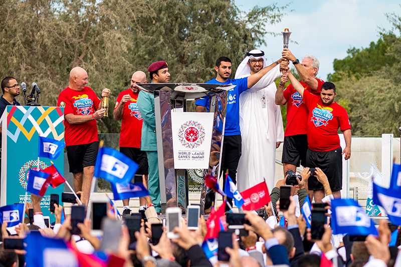 وتقدم الشيخ محمد بن سلطان بن خليفة آل نهيان، نائب رئيس مجلس إدارة نادي أبوظبي الدولي للرياضات البحرية، مسيرة حمل الشعلة باتجاه صرح زايد المؤسس حيث كان معالي الدكتور سلطان أحمد الجابر، وزير دولة الرئيس التنفيذي لأدنوك ومجموعة شركاتها، وآلاف الموظفين في استقبالهم لتبدأ الاحتفالية بقيام أحد رياضيي الأولمبياد الخاص بإنارة "شعلة الأمل".