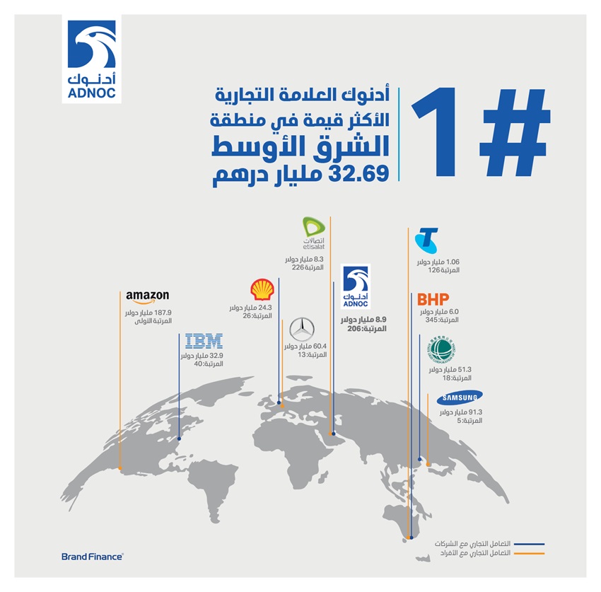 وبالإضافة إلى أدنوك، جاءت علامتان تجاريتان أخريان في الدولة هما "اتصالات" و"طيران الإمارات" ضمن قائمة "براند فاينانس جلوبال 500" التي تصدرتها شركة "أمازون"، وشملت كذلك "آي بي إم" و"شل" و"مرسيدس-بنز" و"سامسونج" و"ستيت جريد" الصينية التي كانت العلامة التجارية الأكثر قيمة في قطاع الأعمال بين الشركات في آسيا.