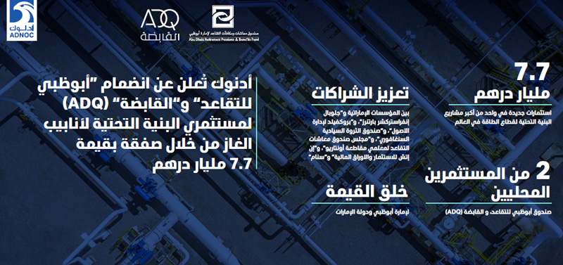 أدنوك تُعلن عن انضمام "صندوق أبوظبي للتقاعد" و"القابضة" (ADQ) لمستثمري البنية التحتية لأنابيب الغاز من خلال صفقة بقيمة 7.7 مليار درهم