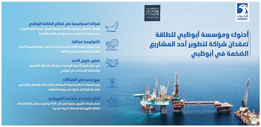 المشروع يساهم في خفض الآثار البيئية لأنشطة أدنوك البحرية بنسبة تصل إلى 30% ورفع الكفاءة التشغيلية وتعزيز موثوقية نظام إمداد الطاقة الكهربائية البحري الحالي