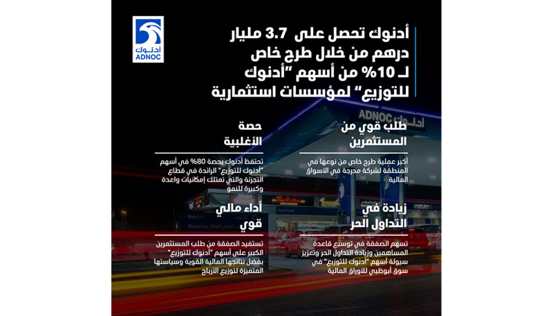 أدنوك تنفذ بنجاح طرح خاص بقيمة 3.7 مليار درهم لحصة من أسهم شركة "أدنوك للتوزيع"