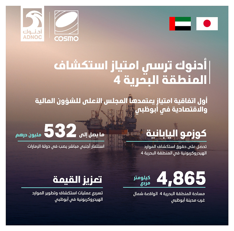 وبموجب الاتفاقية، ستحصل "كوزمو" على حصة 100% في مرحلة الاستكشاف، وستستثمر ما يصل إلى 532 مليون درهم (145 مليون دولار) في عمليات التنقيب وحفر آبار الاستكشاف والتقييم، بما في ذلك رسم المشاركة، لاستكشاف وتقييم فرص النفط والغاز في "المنطقة البحرية رقم 4" التي تغطي مساحة تبلغ 4865 كيلومتراً مربعاً شمال غربي مدينة أبوظبي.