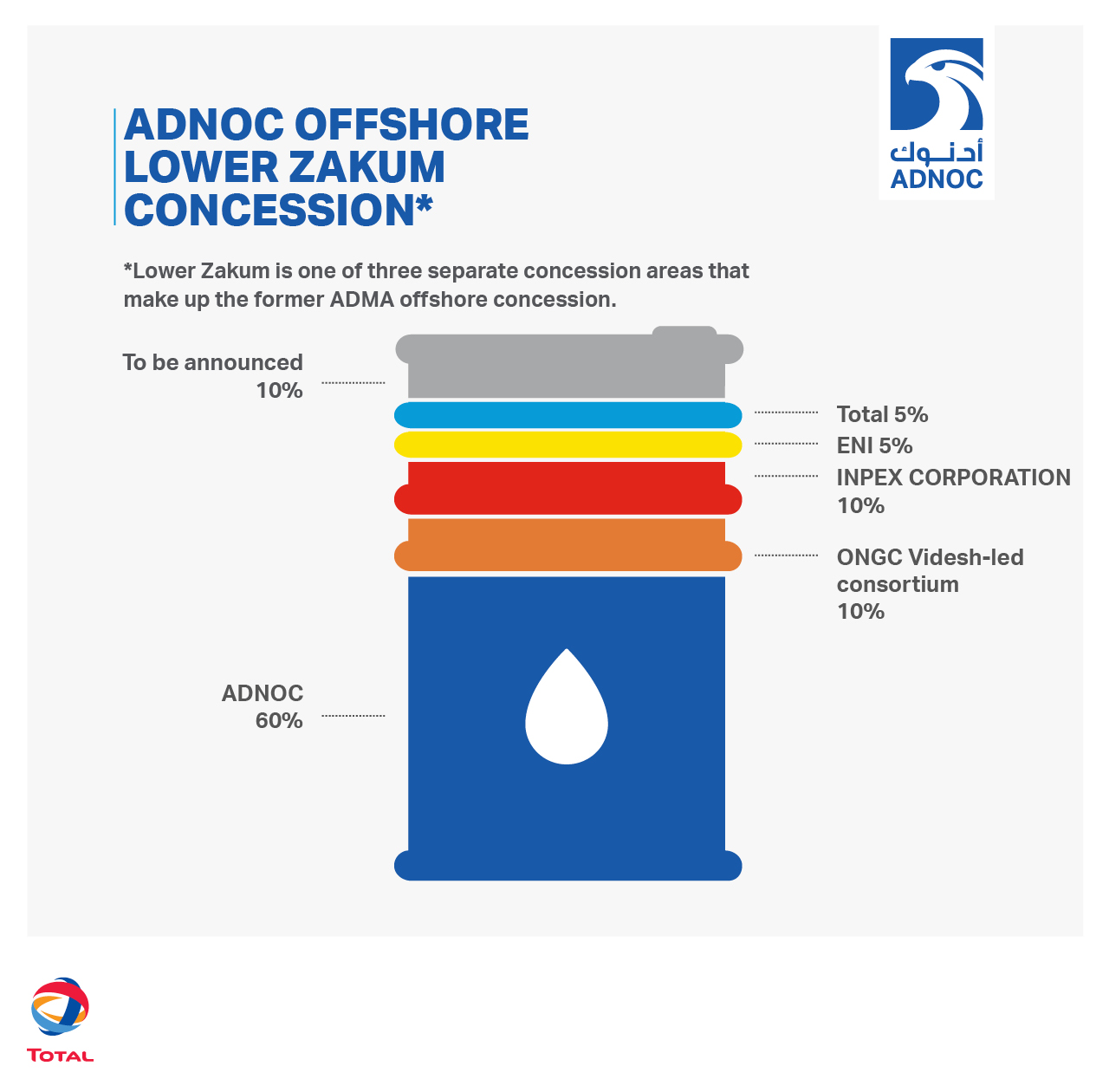 In the Lower Zakum concession, Total joins an Indian consortium, led by ONGC Videsh, Japan’s INPEX, as well as Eni as stakeholders. ADNOC is finalizing opportunities, with potential partners, for the remaining 10% of the available 40% stake in the Lower Zakum concession, and for the remaining 10% stake in the Umm Shaif and Nasr concession. ADNOC retains a 60% majority share in both concessions.