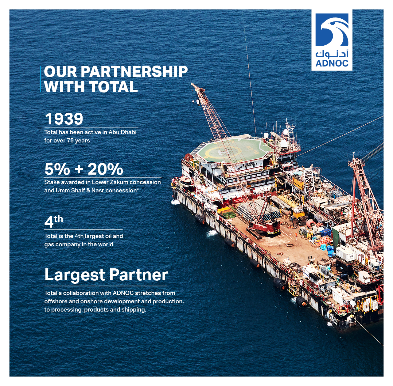 Total contributed a participation fee of AED 4.2 billion (US $1.15 billion) to enter the Umm Shaif and Nasr concession and a fee of AED 1.1 billion (US $300 million) to enter the Lower Zakum concession. Both concessions are operated by ADNOC Offshore, a subsidiary of ADNOC, on behalf of all concession partners.