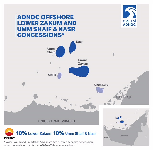 CNPC joins Eni (10%) and Total (20%) as participants in the Umm Shaif and Nasr concession; and an ONGC Videsh led consortium (10%), INPEX Corporation (10%), Eni (5%) and Total (5%) as participants in the Lower Zakum concession. ADNOC retains 60% majority shares in both concessions.