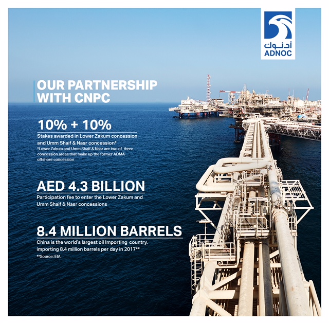 PetroChina contributed a participation fee of AED 2.1 billion (US $575 million) to enter the Umm Shaif and Nasr concession and a fee of AED 2.2 billion (US $600 million) to enter the Lower Zakum concession. Both concessions will be operated by ADNOC Offshore, on behalf of all concession partners.