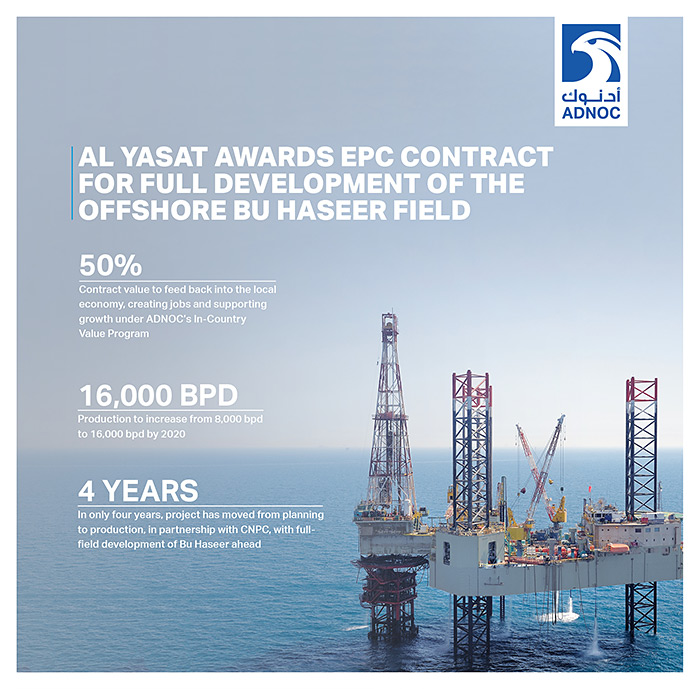 Abu Dhabi, UAE – July 2, 2018: Al Yasat Company for Petroleum Operations (Al Yasat), a subsidiary of the Abu Dhabi National Oil Company (ADNOC) has awarded the Engineering, Procurement and Construction (EPC) contract, for the full development of the offshore Bu Haseer field, to Abu Dhabi’s National Petroleum Construction Company (NPCC).