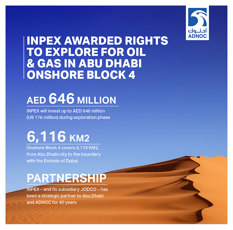 INPEX will hold a 100 per cent stake in the exploration phase, investing up to AED 646 million (US $176 million), including a participation fee, to explore for and appraise oil and gas opportunities in the block that covers an onshore area of 6,116 km2 from Abu Dhabi city to the boundary with the Emirate of Dubai.